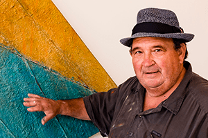 MIKE ELSASS | Dayton based artist Mike Elsass paints on weathered steel in an abstract style inspired by the color field artists. Applying multiple layers of paint and other organic material, Elsass paints, sponges, and sands, often building as many as 40 layers on these steel sheets until the final glazing. Mindful of the moment when paint, color, texture and discovery meet, Elsass considers his art spiritual and meditative. For more information about this artist please visit: www.mikeelsass.com.